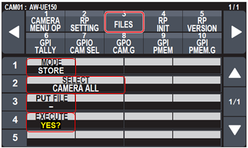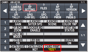 AW-RP150GJ(以降「本機」と呼びます)は、カメラの設定をSDカードに保存することができます。[MAINTENANCE]ボタンを押してから下図のように設定して、F1ダイヤルを押します。
