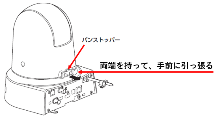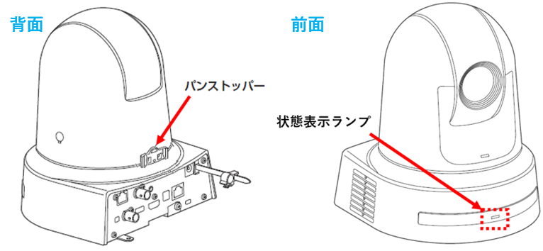 カメラは電源投入後、位置検出を行います。パンストッパーを装着したまま起動した場合、位置検出ができないため、エラー(カメラの状態表示ランプ:赤色点灯)となります。